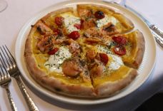 Пицца с кремом из тыквы, бурратой и маринованным лососем